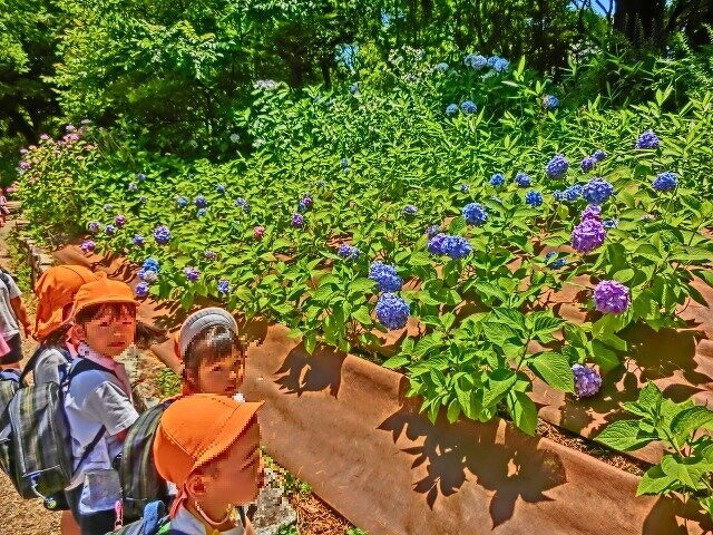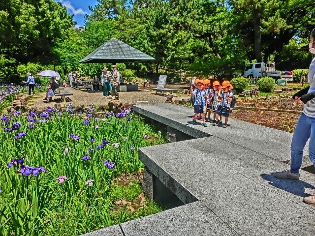 池でアメンボや亀を発見したり、あじさい・しょうぶの花を見たりしてお散歩しました!