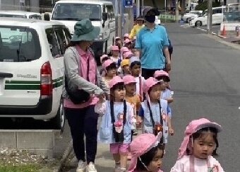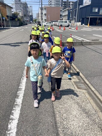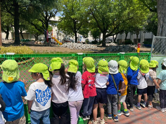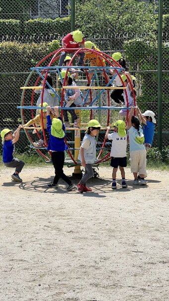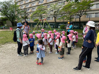 今年は隣の高辻公園が工事で使えないため、近くの高辻南公園にお散歩に行きました。年少さんは、初めてだったので交通ルール説明もしお友だちと手を繋いで歩きました。 遊具で遊んだり、集団遊びをしたり…楽しい時間を過ごしました。 みんな頑張って歩いてヘトヘトでしたが、帰って食べた給食は美味しかったねー!