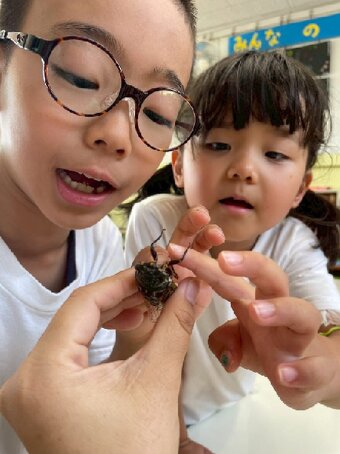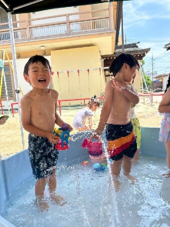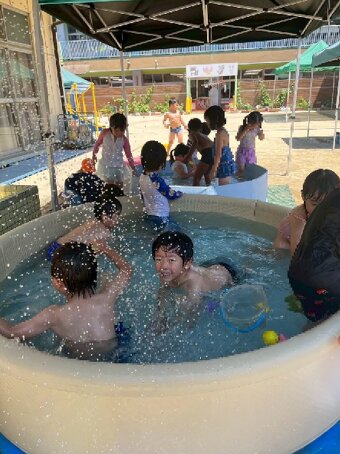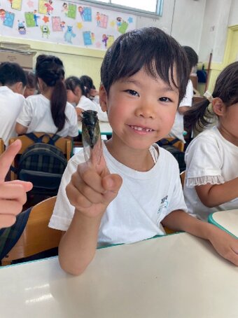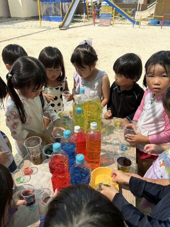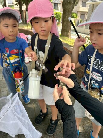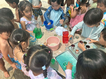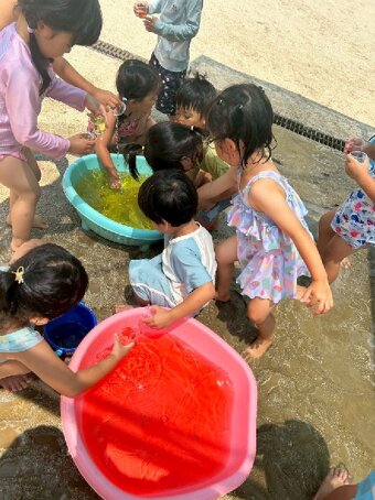 夏季保育では、水遊び、せみとり、色水遊びなど夏の遊びを楽しんでいます。 水遊びの時に色水遊びも楽しみました。 今年は、高辻公園が工事で使えないため、近くの公園まで園バスで行きせみとりを楽しみました。タモと虫かごを持つだけでテンションが上がる子どもたち。 せみが怖い子は、抜け殻探しを楽しんでいる子もいました。