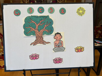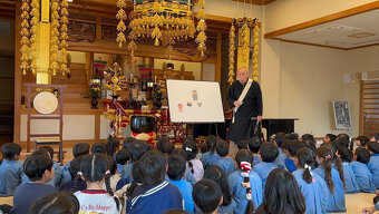 本堂で園長先生によるパネルシアターを観たり、園歌を歌ったりしました。