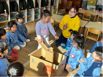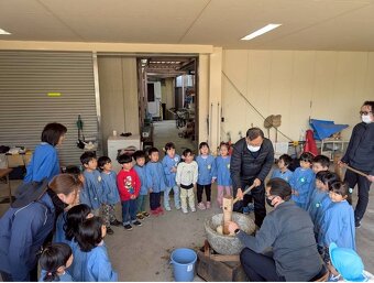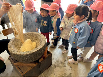 幼稚園でお餅つきをしました。 運転手さん、先生がつく時に「よいしょー!」と声をかけてくれたよ。 年長組はつかせてもらいました。もち米から、お餅になるなんてびっくり!目を輝かせて見ていたみんな。 給食の時間にみんなで食べましたー!つきたてのお餅は柔らかくて美味しかったねー! 部屋で餅つきごっご楽しみました。