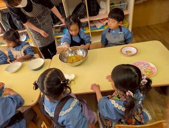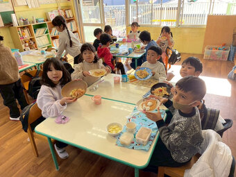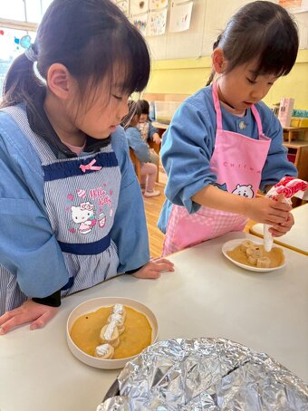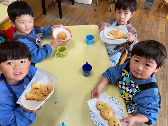 みんなが楽しみにしていたクッキングの日。みんなのエプロン姿がかわいい。 年長組はお好み焼き 年中組はクレープ 年少組はクッキー 満3歳組はたまごボーロを作りました。 アレルギーの子も楽しめるように工夫して作りました。 美味しかったねー。