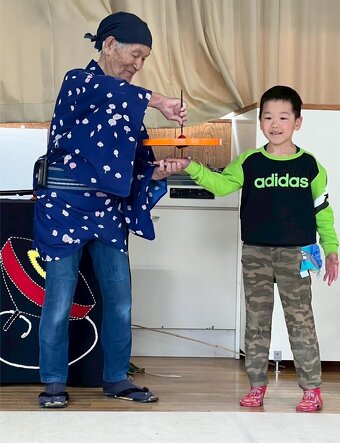みんな大好きコマのおっちゃんが幼稚園に遊びに来てくれました。おっちゃんの面白いコマ、すごい技に釘付けであっという間の時間でした。