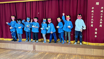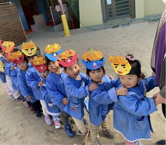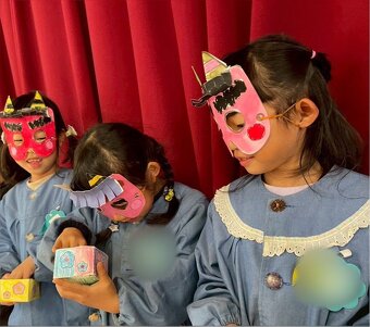各学年、自分たちで作った素敵なお面をかぶって、舞台の上から豆をまきました。飛んでくる豆を拾うのもとっても楽しんでいました。